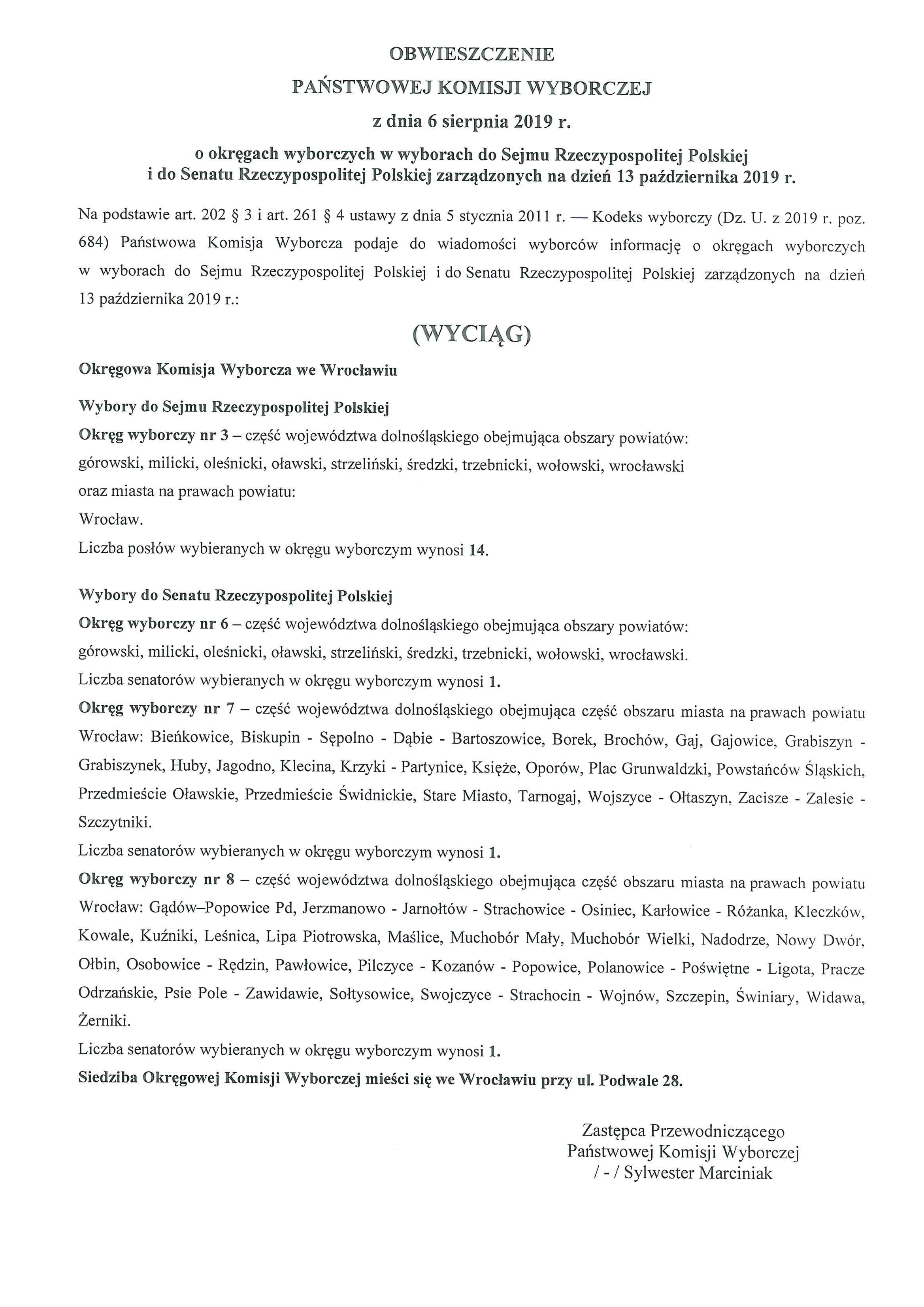 Obwieszczenie Państwowej Komisji Wyborczej we Wrocławiu z dnia 6 sierpnia 2019 r. o okręgach wyborczych w wyborach do Sejmu Rzeczypospolitej Polskiej i do Senatu Rzeczypospolitej Polskiej zarządzonych na dzień 13 października 2019 r.