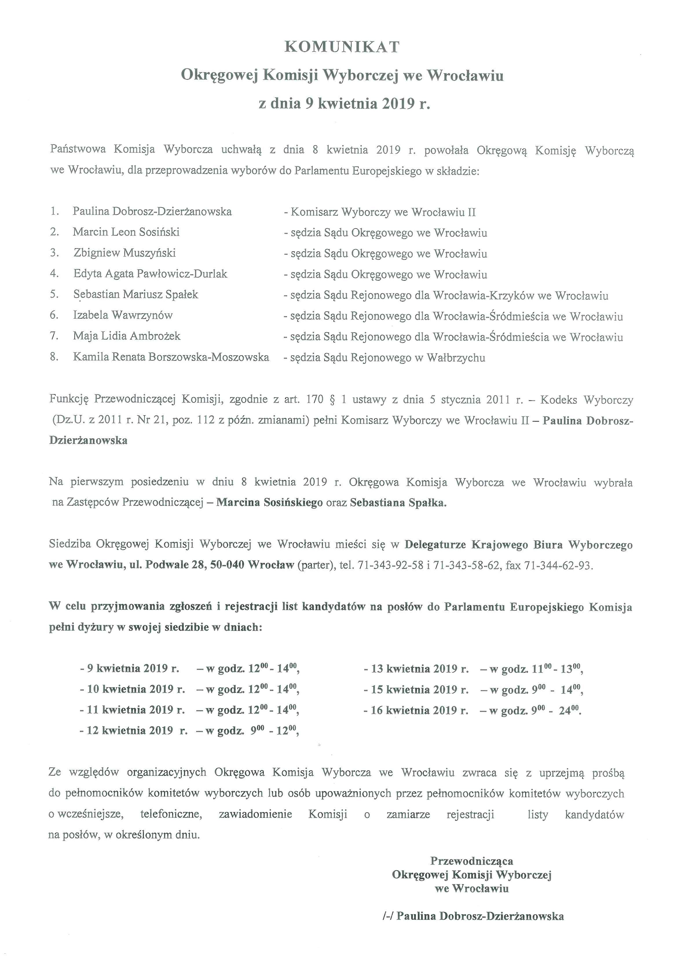 Komunikat Okręgowej Komisji Wyborczej we Wrocławiu z dnia 9 kwietnia 2019 r. - powołanie OKW