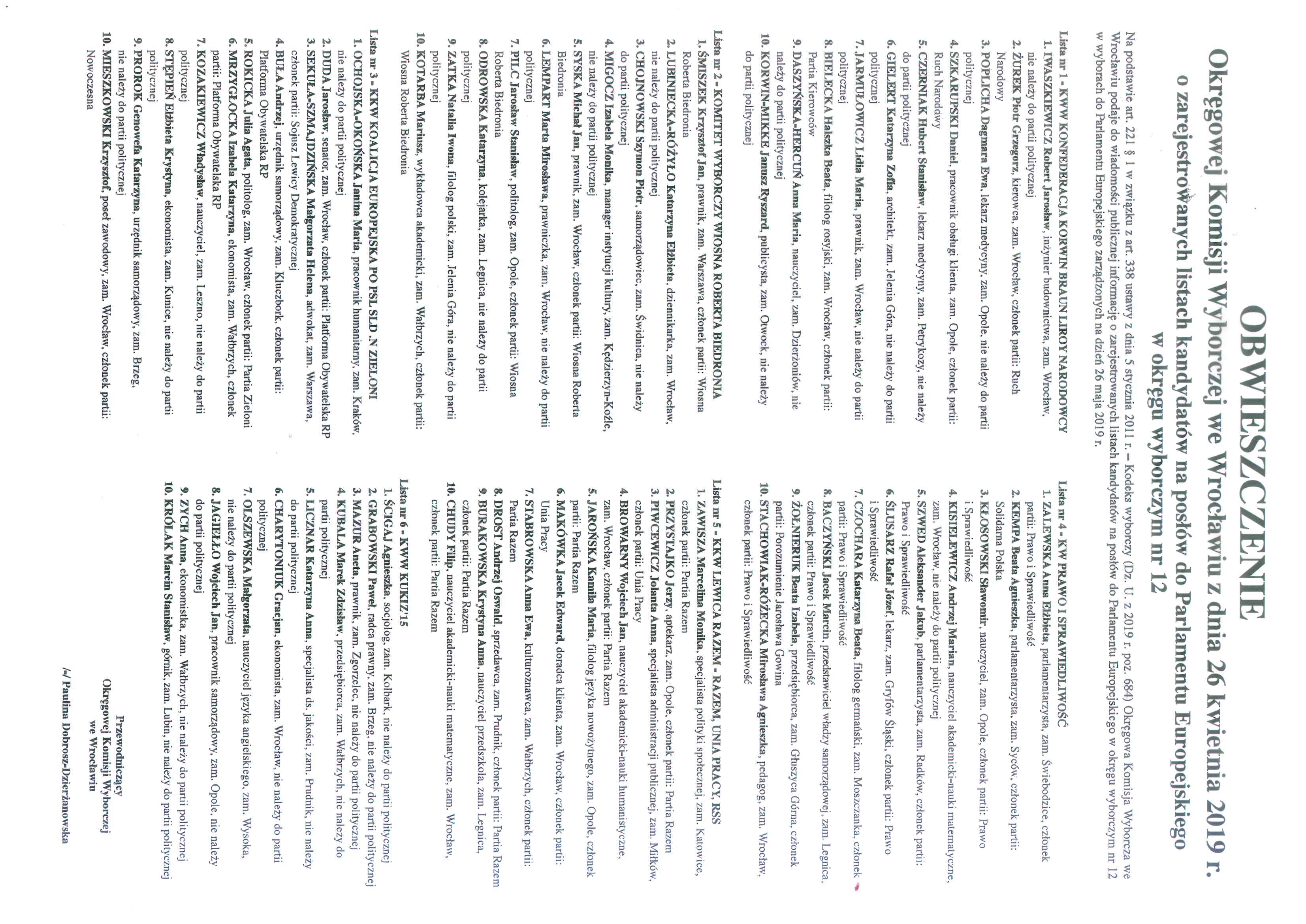 Obwieszczenie Okręgowej Komisji Wyborczej we Wrocławiu z dnia 26 kwietnia 2019 roku o zarejestrowanych listach kandydatów na posłów do Parlamentu Europejskiego w okręgu wyborczym nr 12.