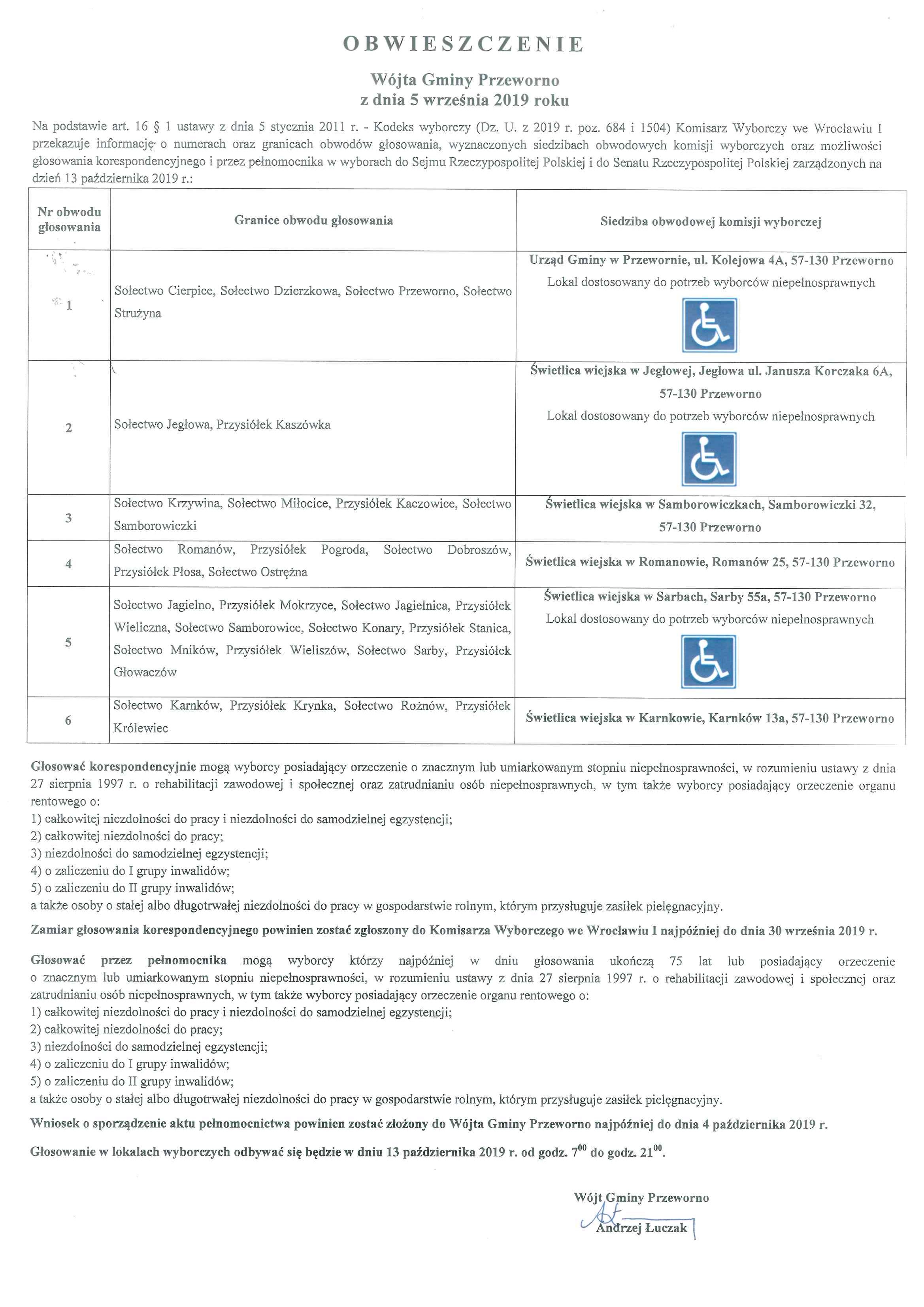 Obwieszczenie Wójta Gminy Przeworno z dnia 5 września 2019 r. o numerach i granicach obwodów głosowania oraz siedzibach obwodowych komisji wyborczych, w tym o lokalach przystosowanych do potrzeb osób niepełnosprawnych, a także o możliwości głosowania korespondencyjnego przez wyborców niepełnosprawnych i możliwości głosowania przez pełnomocnika.