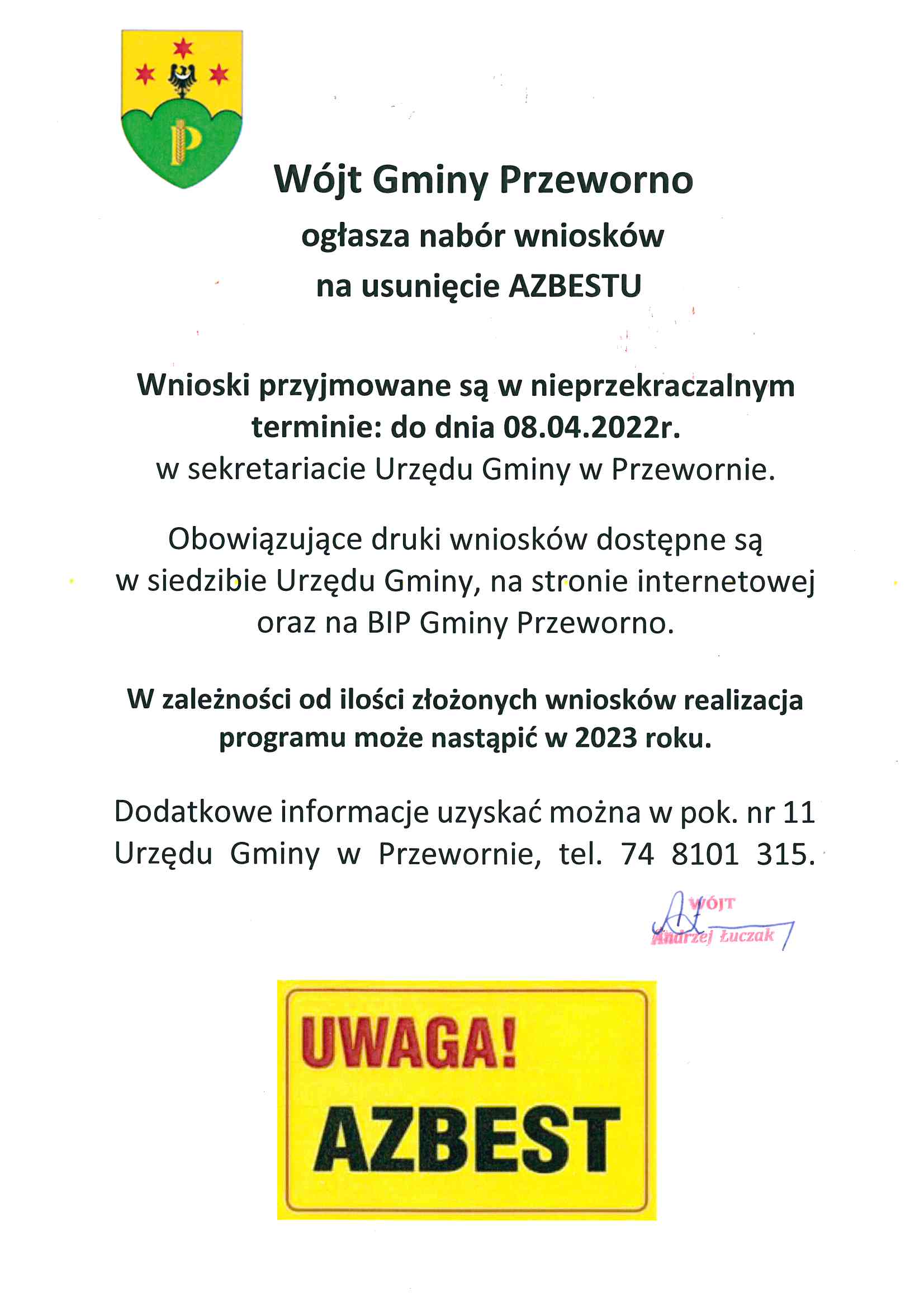 WÓJT GMINY PRZEWORNO ogłaszana nabór wniosków na usunięcie azbestu